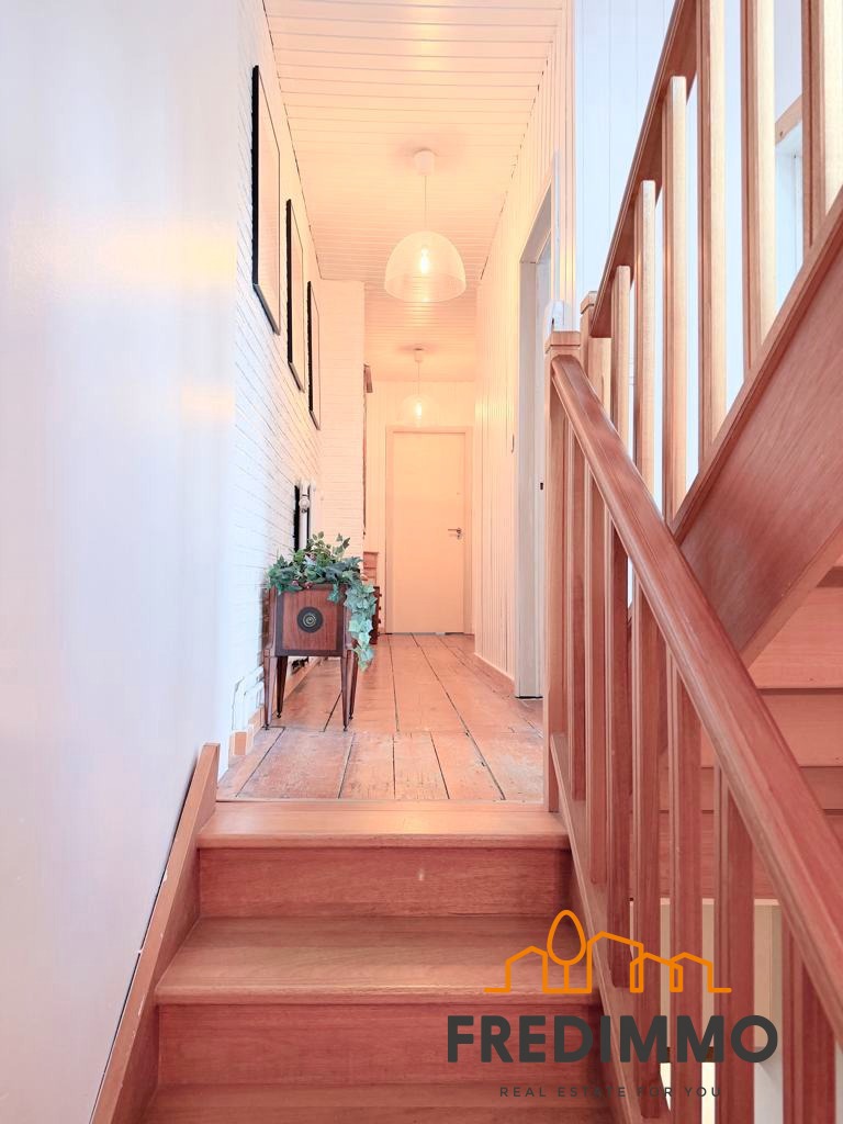 Verdieping: drie lichte slaapkamers met plankenvloer, waarvan één grotere met eigen badkamer. Een tweede volledige badkamer (bad, dubbele lavabo, WC), klein terras en dressing op het tussenverdiep.