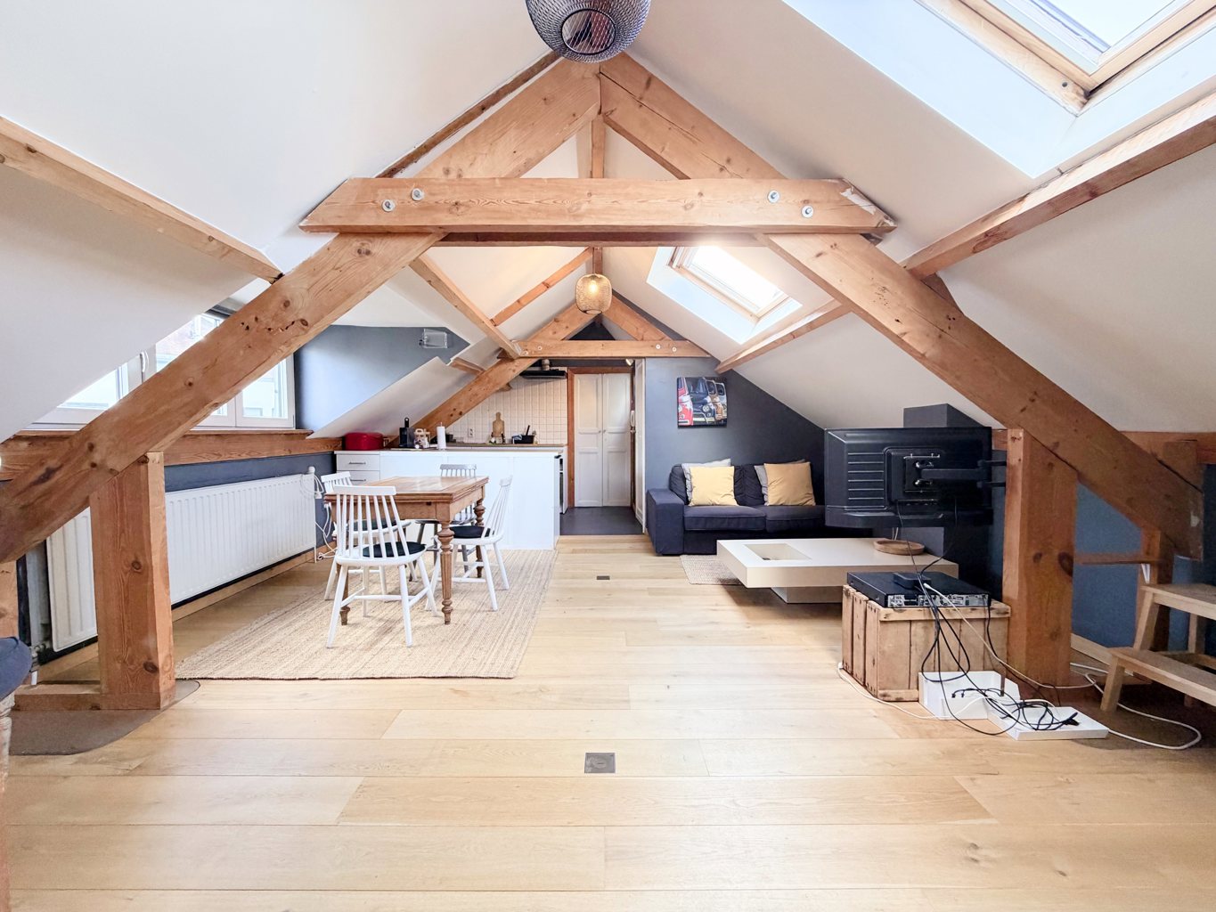 De zolder is ingericht als een onafhankelijke ruimte met woon- en eetkamer, keuken, slaapkamer en badkamer — ideaal voor een tiener, studio of ruim kantoor. Kelderverdieping met bergruimtes en stookplaats.